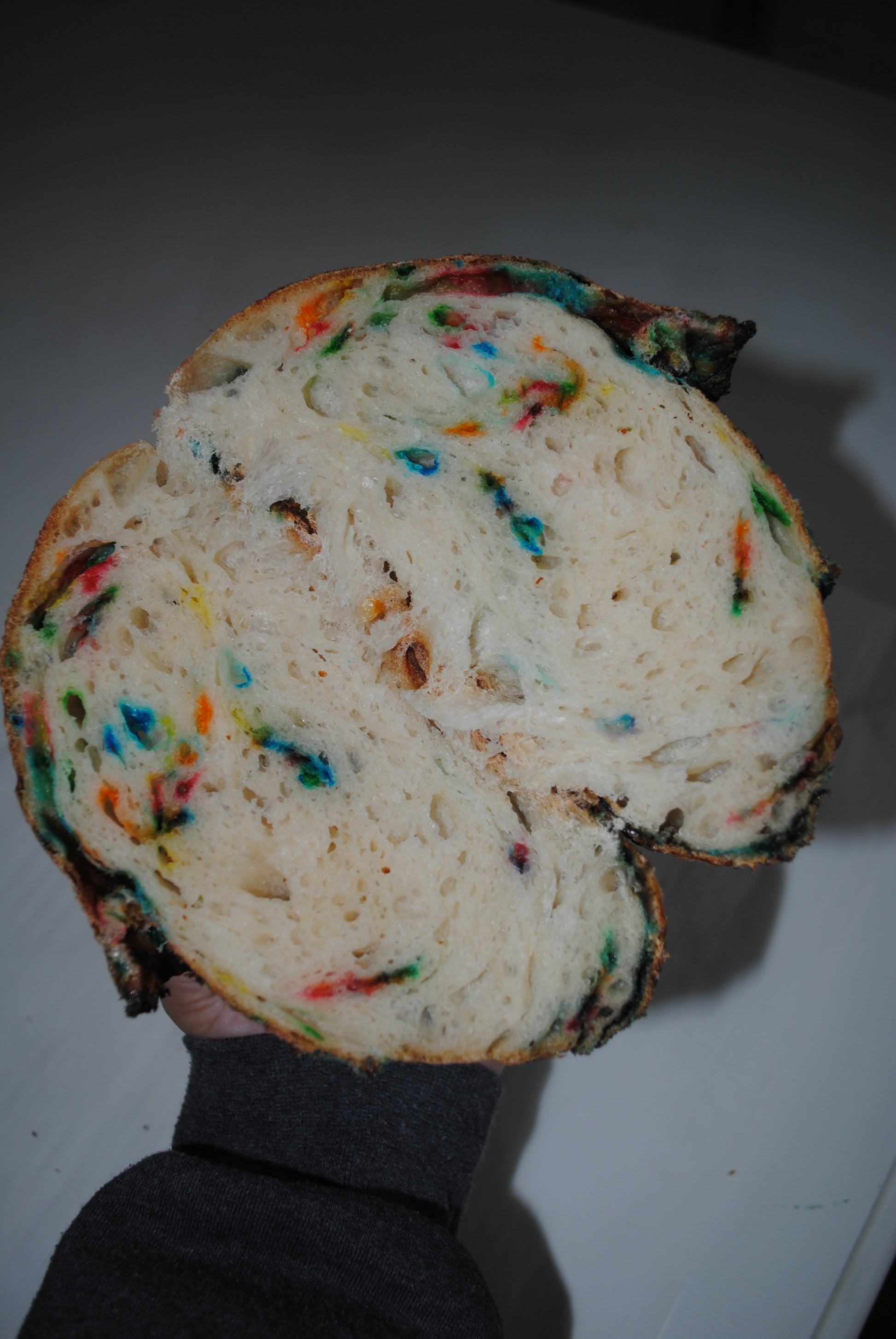 Ingredients: Organic bread flour (wheat), water, rainbow sprinkles (cane sugar, potato starch, vegetable color [spirulina, red radish, turmeric, annatto], carnauba wax), sourdough starter (organic all purpose flour [wheat], water), salt