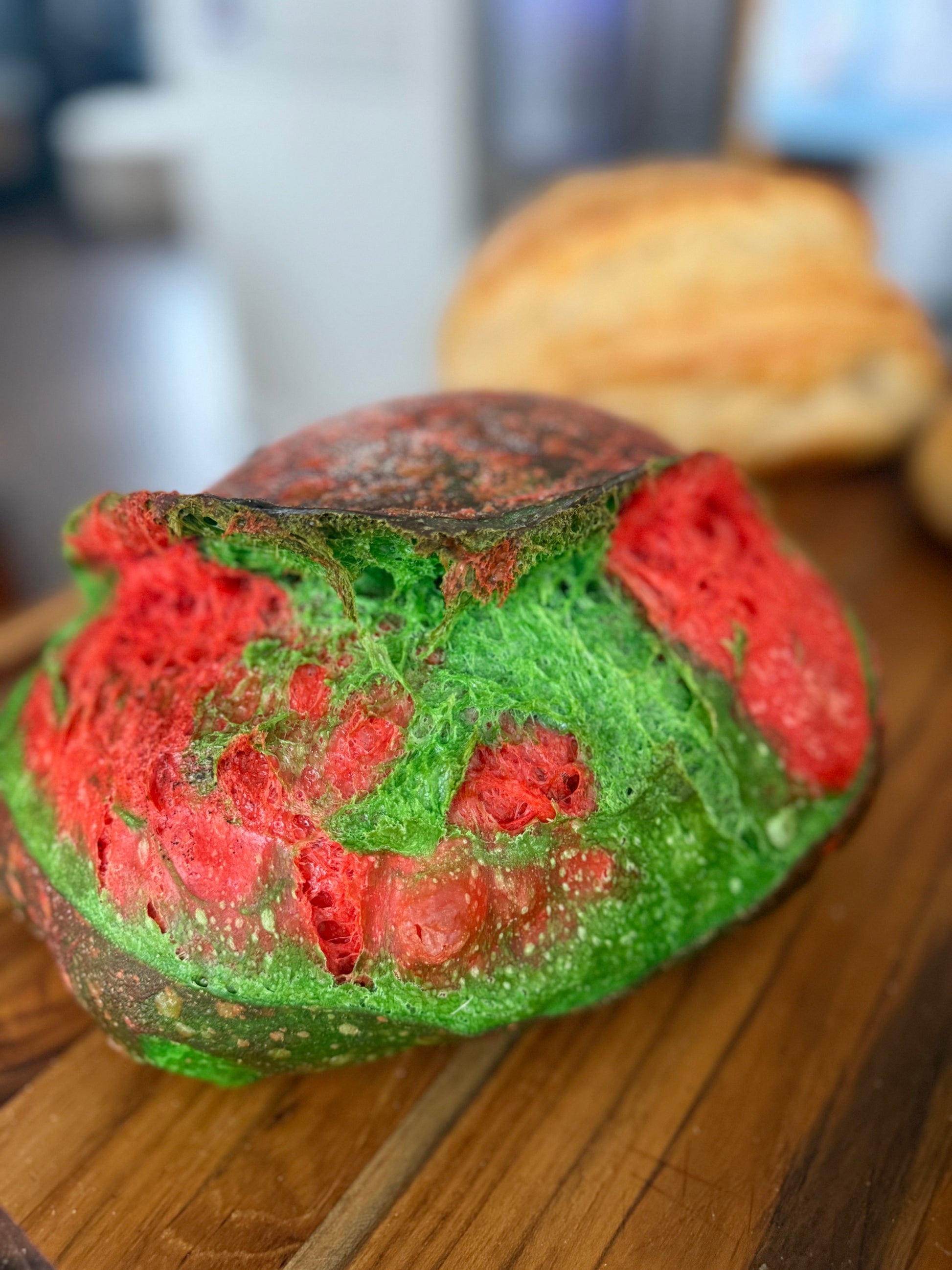 Ingredients: Organic bread flour (wheat), water, sourdough starter (organic all-purpose flour [wheat], water), salt, green coloring gel, red coloring gel.